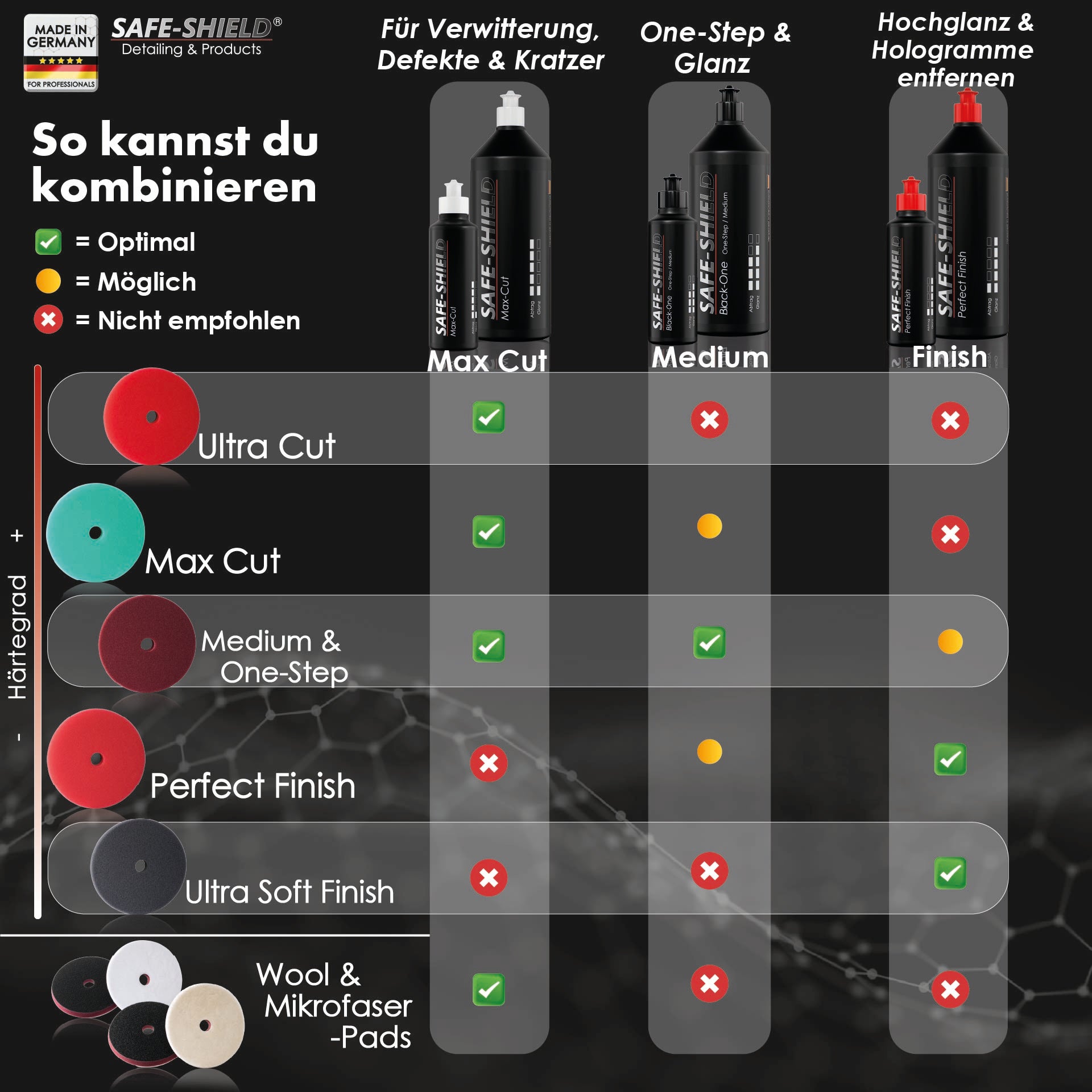 Ideal abgestimmt auf unsere Perfect Finish & Ultra Soft Thermo Polierpads, sorgt sie für maximale Feinbearbeitung, überzeugenden Tiefenglanz und höchste Oberflächenreinheit. Dank der staubfreien Formel bleibt die Verarbeitung sauber und angenehm, während sich die Politur nach dem Ausfahren besonders leicht abnehmen lässt – ohne Schlieren, ohne Kraftaufwand.
